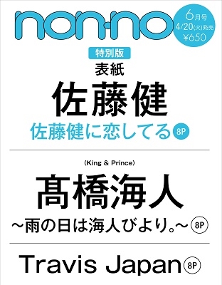 2021-03-19 non-no 2021年6月号 雑誌 King & Prince ジャニーズJr. 🗓発売日:2021年4月20日 ✔️表紙 通常版:新川優愛/特別版:佐藤健 ✔️掲載 ・髙橋海人[King & Prince] 8P ・Travis Japan 8P ☆予約 ・タワーレコード ・Amazon ・楽天ブックス ・セブンネット